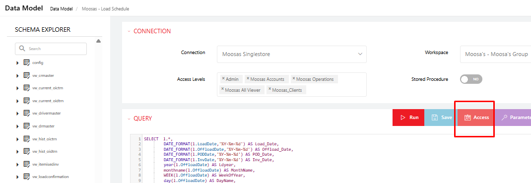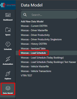 Navigate to the Data Model menu and select the Data Model where the dashboard's data pulls from. In this example, it will be "Moosas - Load Schedule" Data Model.